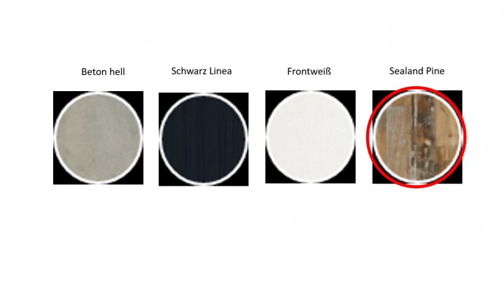 Farben & Muster für Ablage & Wandschoner: Beton hell, Schwarz Linea, Frontweiß, Sealand Pine